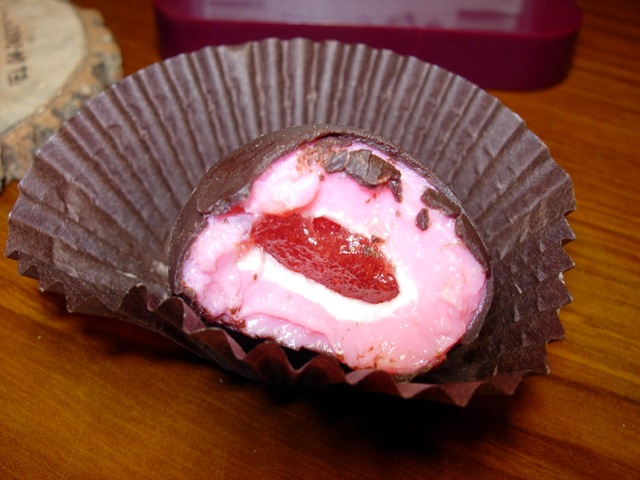 為了湊PCHOME 24小時購物區的五百元免運費,決定買來吃吃看.口感不錯~QQ的最外層是巧克力下一層是草莓口味麻糬再下一層是棉花糖最中心的是草莓果醬很適合嚐鮮,但不要太常吃因為一盒6顆賣50元覺得有點小貴 打開外包裝紙盒後,內包裝又有一層真空的黃色花紋塑膠袋保鮮 開盒照~六小顆 單顆正面大特寫 單顆背面大特寫 咬一口大特寫