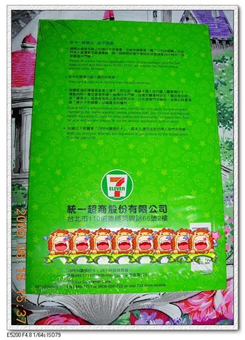 中間是預付卡費率說明,每6秒0.71元,也就是每分鐘7.1元,國內簡訊2元(一般打網外每分鐘要9.6元,所以打網外和傳網外簡訊就賺到了^.^) 有效期限半年,半年後沒儲值門號就沒用哩!