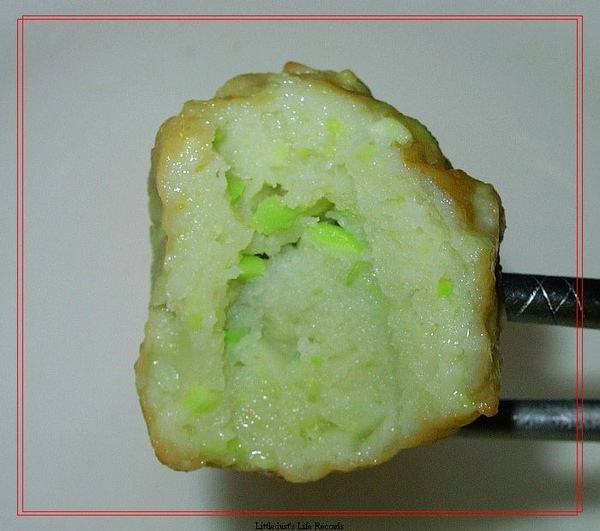 這顆丸子完全不Q,裡面包的是很多毛豆粒,吃起來豆味蠻重的。這應該是"毛豆炸"吧?