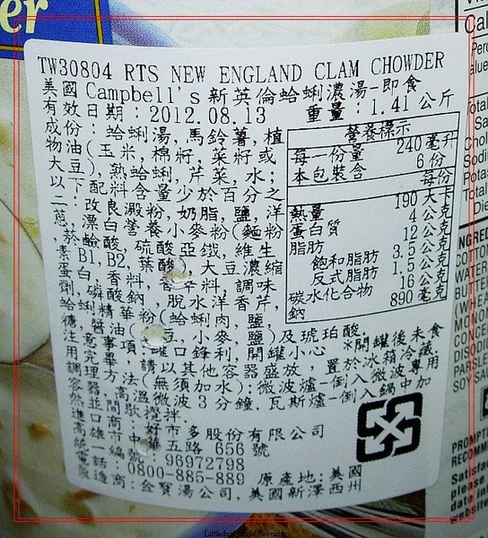一直耳聞它的好喝,連買的時候,旁邊的人也一直跟他朋友說很好喝! 我曾在1F買過一碗來喝過,聽說是Campbell's新英倫蛤蜊濃湯倒出來加熱賣的。 所以這次有特價,我就敗回來啦~二大鐵罐。 快速&簡單的烹調指示:絕對不要加入牛奶和水:加熱時,不時地攪拌。